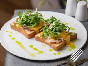 Класичні яйця пашот на хрусткому тості з ніжним голландським соусом, беконом та зеленню. Почніть ранок зі смаку вишуканості.