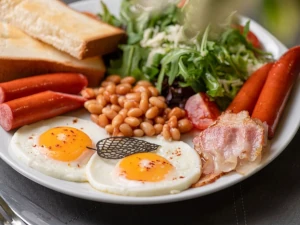 Ситний сніданок: ковбаски, яєчня, бекон, томати, тост та бобами в соусі. Ідеальний вибір для енергійного старту дня.