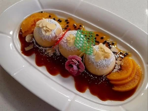 Сирники з соусом манго-маракуйя та солоною карамеллю